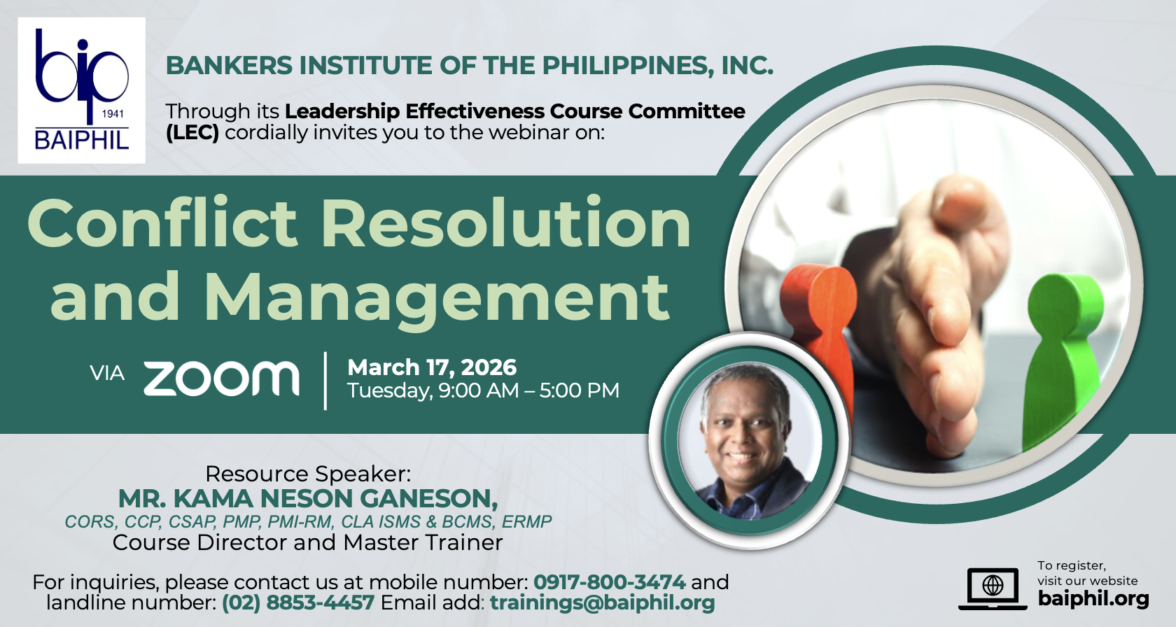 Seminars and Training Fundamentals of Credit – Module 5: Basic Accounting and Financial Analysis, Module 6: Cash Flow Analysis & Module 7: Financial Spreadsheets, Validation and Projections Module Name: M5 Basic Accounting And Financial Analysis Description: The Basic Accounting… Continue reading » | 0 Comments Accounting for Non-Accountants (with Financial Statement Analysis) Course Outline: DEFINITION; PHASES OF ACCOUNTING; PURPOSE AND IMPORTANCE OF ACCOUNTING; USERS… Continue reading » | 0 Comments Conflict Resolution and Management Program Overview Every person faces conflict. There are both positive and negative… Continue reading » | 0 Comments Third Currencies Counterfeit Detection Program Description It is a course which features the following: The Basic… Continue reading » | 0 Comments 1 2 3 … 8 9 Next