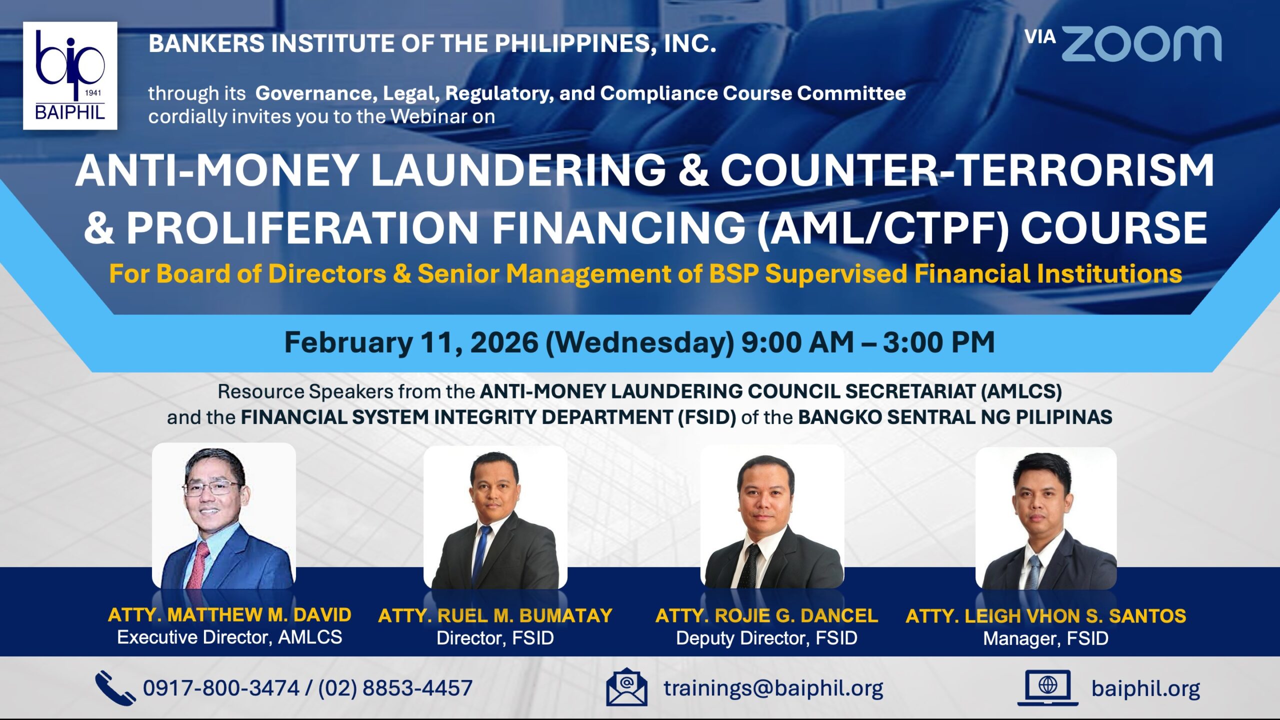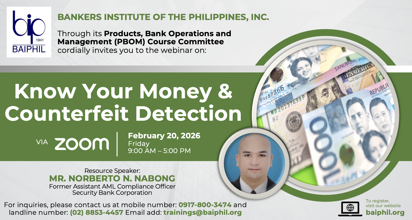 Seminars and Training Anti-Money Laundering & Counter-Terrorism & Proliferation Financing (AML/CTPF) Course For Board of Directors & Senior Management of BSP Supervised Financial Institutions Course Outline: Date/Speaker Module Title/Topic Time Duration SME 11 February 2026… Continue reading » | 0 Comments Basic Leadership and Effective Supervision Seminar (BLESS) for Bank Supervisors Course Outline: Understanding the Supervisory Function – Who is a Supervisor? The… Continue reading » | 0 Comments Basic Identification Documents, Business and Income Documents Verification This one-day online seminar aims to provide skills and knowledge to all… Continue reading » | 0 Comments Know Your Money and Counterfeit Detection COURSE OUTLINE: Know Your Money Introduction: Basic Knowledge & Importance of Knowing… Continue reading » | 0 Comments Previous 1 2 … 8 9 10 11 12 13 Next